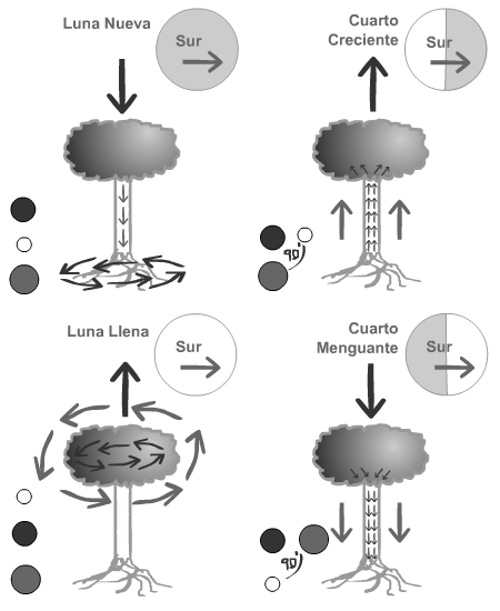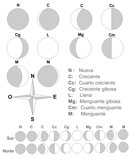 En el hemisferio sur, crece de izquierda a derecha. Cuando parece una C es Creciente, y cuando forma una D es Decreciente o Menguante.
