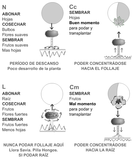 En luna creciente planto todo a lo que le vaya a usar la hoja y en decreciente los frutos (flores, semillas) o todo lo que crece bajo la tierra (tubérculos, raíces).